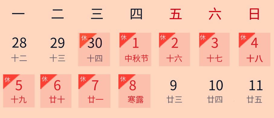 2020国庆中秋喜相逢,这个假期与众不同! 动力时代响应国务院号召,安排2020.9.30-2020.10.8放假, 9号开始正式上班。 预祝大家花好月圆人团圆,事业顺利步步高,阖家幸福永平安! 有任何紧急情况,请电话联系如下: 国内市场:彭小姐-13823685780 国际市场:Sunny-13510752260